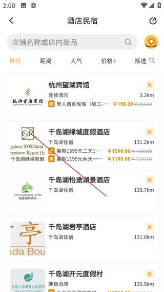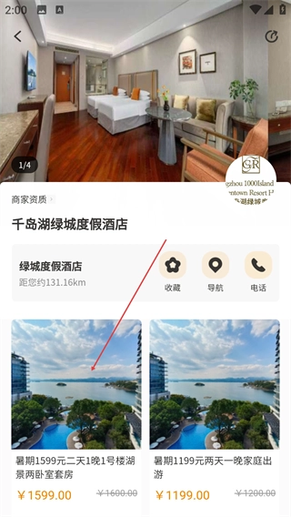 在酒店民宿列表页面,能够查看各类酒店的相关信息(比如距离、价格等),挑选好目标酒店(例如【千岛湖绿城度假酒店】)后,点击即可进入该酒店的详情页面。