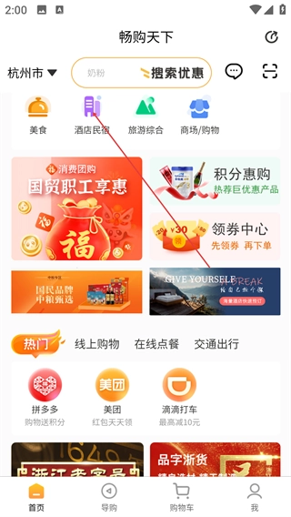 1、打开【畅购天下】首页,点击顶部的【酒店民宿】分类入口,即可进入对应的商家列表页面。