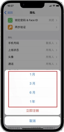2. 可选择1月、3月、6月或一年的时长,若在选定的时间范围内完全没有上线,电报系统将自动删除账号,其中包含聊天记录、个人信息等所有相关内容。