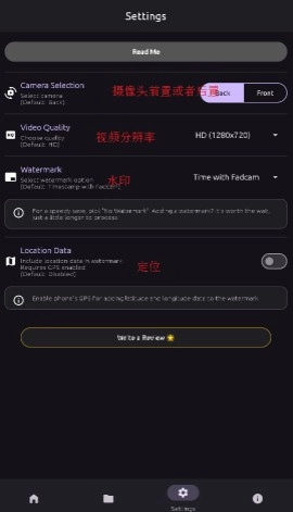 最后在设置界面,可对摄像头的前置或后置、视频分辨率、水印、定位等进行设置。