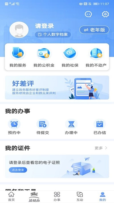 6、“我的”板块,致力于为用户提供专属且便捷的个性化服务,涵盖我的办事、我的证件、我的账户、我的缴费等相关内容。