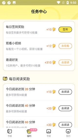 2、完成“福利”页面对应的任务,就能领取能量并用于其中。