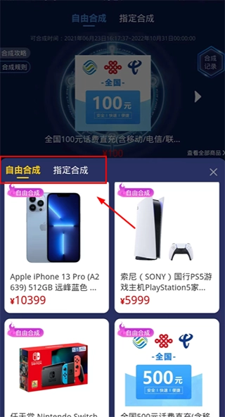 若用户对盲盒开出的商品不满意,可参与合成商城的合成活动。合成活动主要有自由合成与指定合成两种类型: