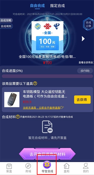 自由合成:道具商品抽奖有概率,道具商品可以发货或者作为道具使用,不能作为合成材料使用。道具名称有赠送表示平台额外赠与,不影响道具盲盒本身的开盒概率。可以选择一个或者几个盒柜中的商品合成页面展示的目标合成商品,必须满足在合成活动时间内开盒的商品(开盒时间在活动时间内)并且没有完成发货或者转让,仍然在盒柜中才能参与对应目标合成商品进行合成。