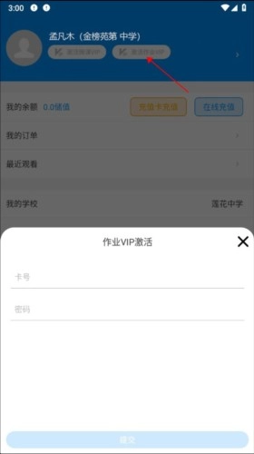 1、打开并登录新教育学生端,进入【我的】页面后,点击页面顶部的【激活作业VIP】(即下图红色箭头所指的区域),随后在底部弹出的对话框里输入老师提供的卡号和密码。