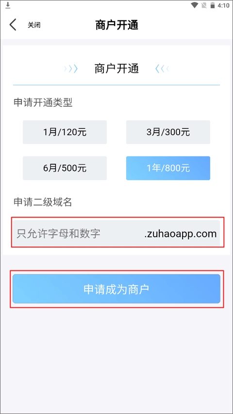 (3)接下来是申请你网站的二级域名,按照提示输入你预先想好的名称后,点击“申请成为商户”按钮就可以了,之后等待工作人员的审核通知就行。
