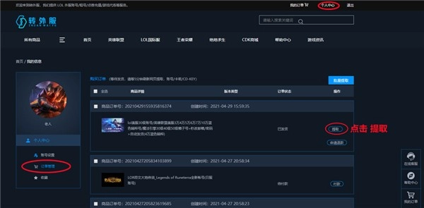 5、购买成功后,请点击网站右上角进入个人中心,在购买订单里查看订单状态。成功付款后,按照页面提示提取货。