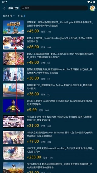 2、点击代充板块,选择你要充值的项目,这里以姜饼人王国为例进行说明。