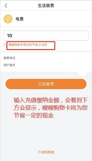 6、进入缴费页面,输入金额后,您会看到金额下方有一行红色小字,显示嗖嗖购物卡能为您节省的现金数额。大家都清楚了吗?