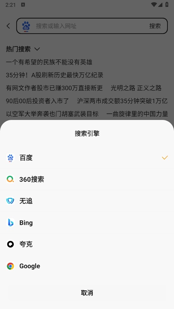 2、系统默认使用百度浏览器,在弹出的页面里挑选你想要更换的浏览器即可,目前支持必应、360、搜狗、夸克等多个选项。
