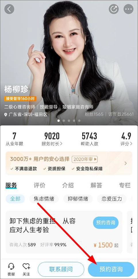 4、用户可依据自身实际情况,挑选预约咨询服务的主题,选定咨询方式(电话、视频)、服务单价以及具体时间,完成付款后即可成功预约。