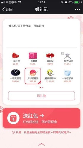 电子请帖发送给他人后,页面底部设有送礼板块,礼物金额各不相同。新人双方会收到等额的礼物,相关金额会显示在婚礼纪平台的余额中,余额可用于提现或平台内消费。不过,提现时需扣除0.6%的微信支付服务费。
