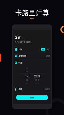 2、本软件支持后台运行,能够精准统计你的步行步数、距离、速度以及热量消耗情况。