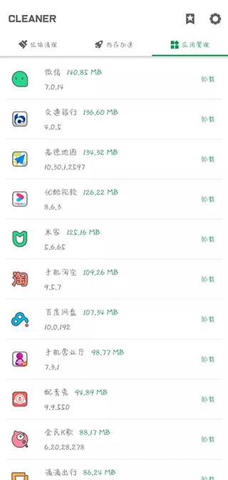 1、最后是应用管理功能,在这里你可以轻松查看每个应用的大小、版本号等信息。