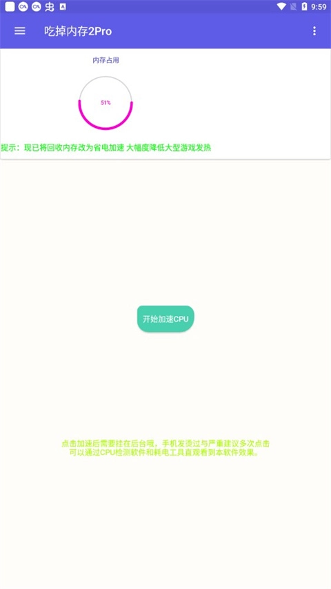 4、点击加速后需保持后台运行哦,若设备发烫较严重,建议多次点击加速;通过CPU检测软件和耗电监测工具,能直观看到本软件的优化效果。