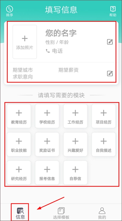 启动后,在“信息”页面(也就是首页),填写个人的简历信息。填写要点如下: