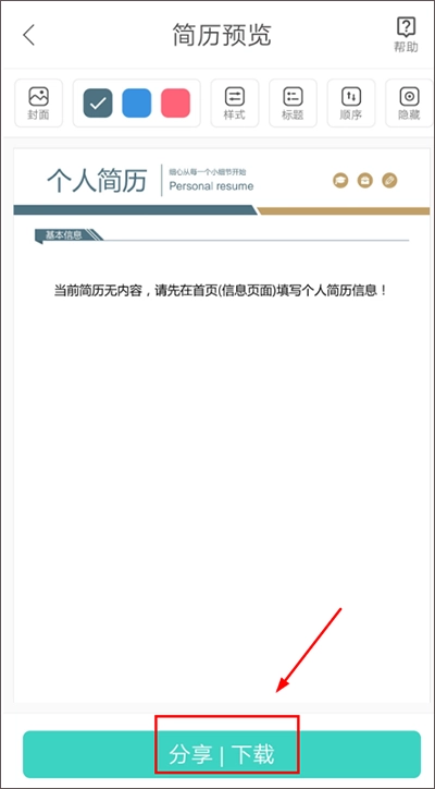 进入“简历阅览”页面后,点击底部的“分享|”按钮,就能完成分享以及保存到相册的操作。