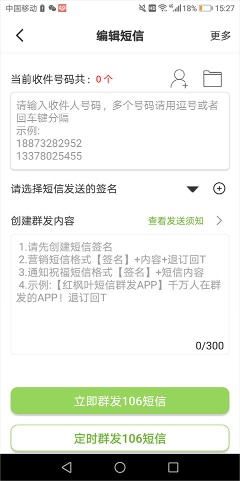 2、进入打开的编辑页面后,输入对方的号码(多个号码可通过逗号或回车键分隔),并添加短信签名,然后按照提示的格式编辑内容。
