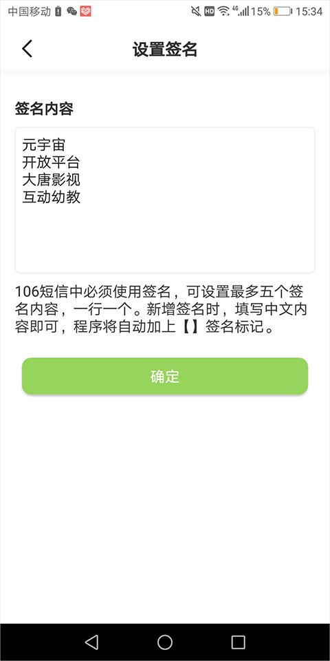 在弹出的新页面里输入中文内容,输入时每个签名单独占一行,最多可输入五个签名,输入过程中软件会自动为每个签名添加【】标记。输入完毕后点击“确定”按钮就可以了。