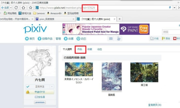 4、在网址里把随机选中的画师id删掉,替换成你想找的画师id,然后按下回车键(enter键)。