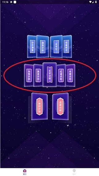 2、进入首页后,中间位置设有识别功能区,包含动物、蔬菜、文字、红酒、车辆识别等选项。