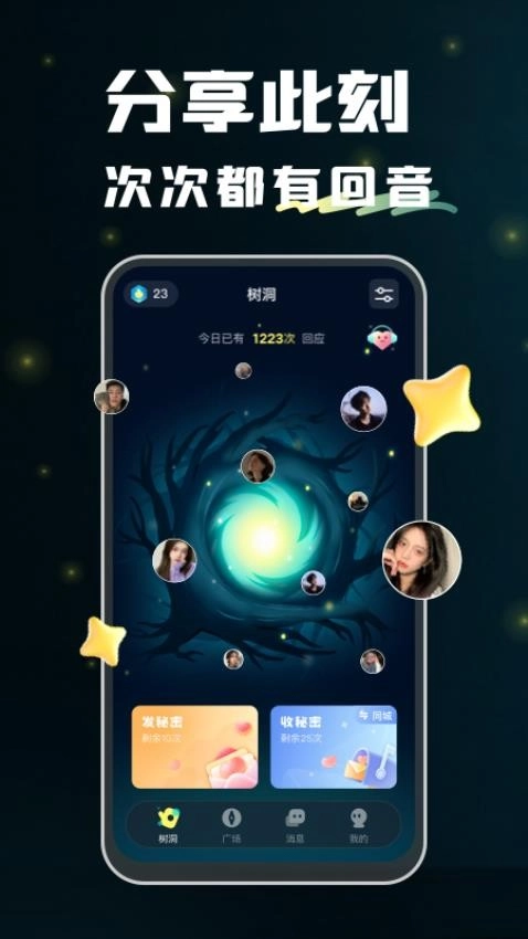 把你的想法说给树洞听,马上就能收到回应,让你的分享欲得到满足。