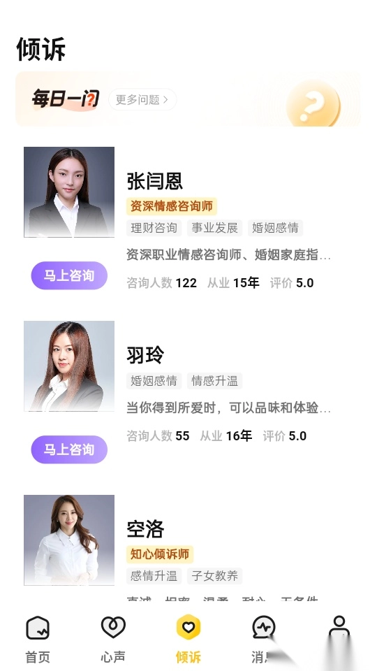 1、平台汇聚了大量情感咨询师,丰富的咨询师资源能够满足不同用户的多样化咨询需求。