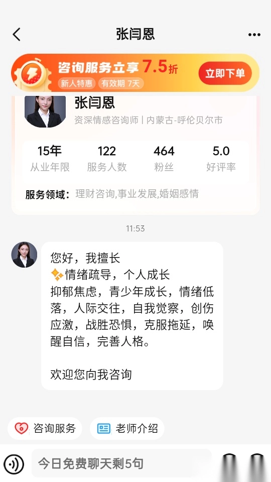 5、这样就能进入聊天室进行咨询,实时倾诉自己的内心想法。