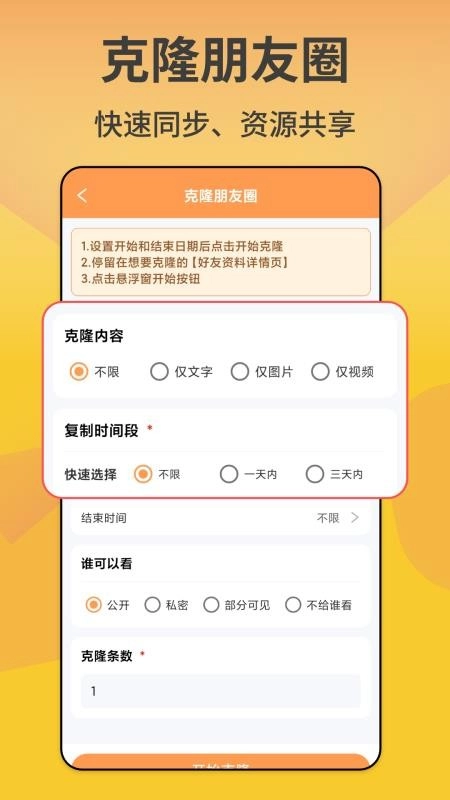 根据实际需求,还能实时克隆相关的朋友圈内容,助你一键复制所需的朋友圈并完成发布,实现快捷分享。