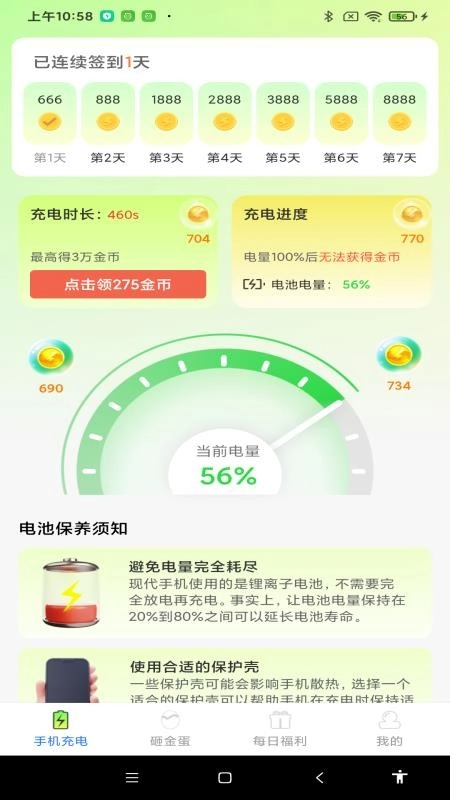 软件支持线上充电赚钱功能,可实时记录充电时长,方便用户领取充电金币。