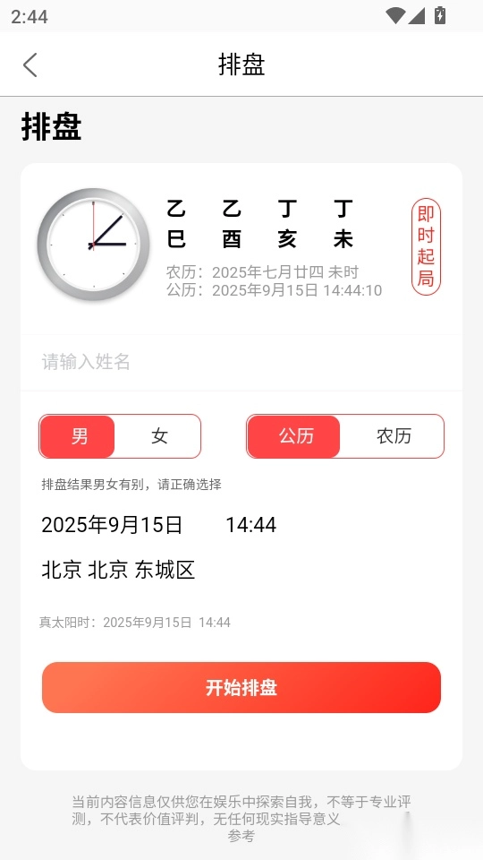 3、点击“开始排盘”按键,就能一键测评排盘运势。