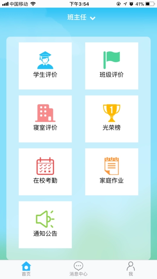 2、进入首页后,可选择学生评价、在校考勤、家庭作业等功能使用。