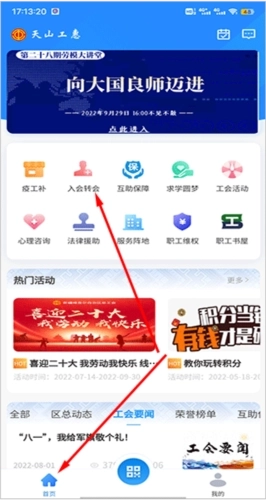 2、登陆成功后,点击首页进入,然后选择“入会转会”功能申请入会;