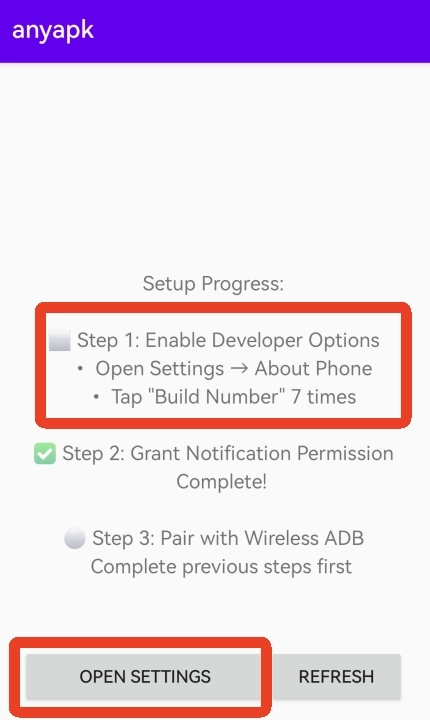 4、之后回到anyapk软件内,能看到第一步前面出现了绿色的√。接下来要进行第三步,即与无线ADB配对。再次点击左下角的【OPENSETTINGS】按钮。