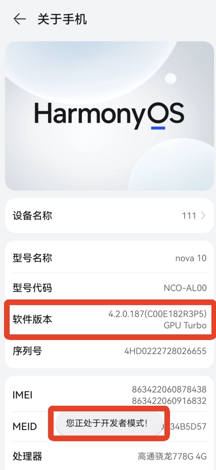 3、接着连续点击版本号7次,多点击几次即可进入开发者模式。部分手机的下方会出现【您正处于开发者模式】的提示,由于手机型号存在差异,显示的内容可能会有所不同。