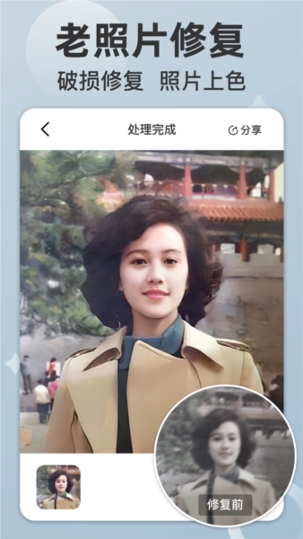 【照片修复大全】借助人工智能修复技术,能对模糊、低清的照片以及带有斑驳痕迹的照片进行修复,还专门针对面部实现了高清还原,助您重拾珍贵的回忆。