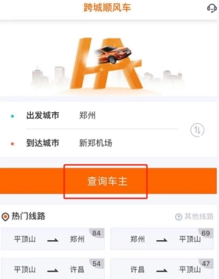 2、请点击:我要出行-输入行程起止点-查询车主。