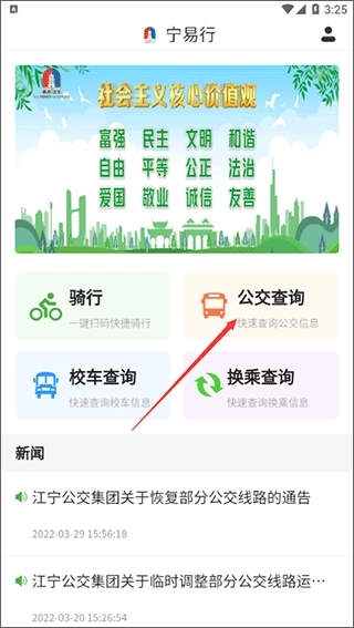 1、通过我们平台的宁易行应用打开进入后,在软件里既能扫码骑行共享单车,也能查询公交、换乘、校车信息等内容,这里就以公交查询为例进行说明;