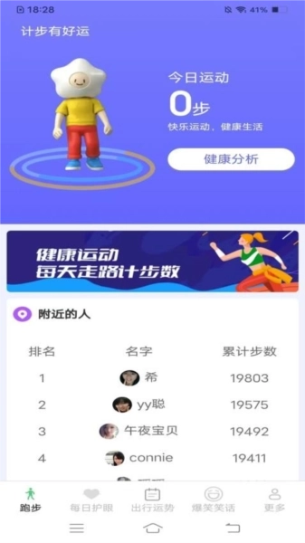2、在跑步页面,你可以详细了解自己的运动步数,同时也能查看附近用户的运动排名情况。