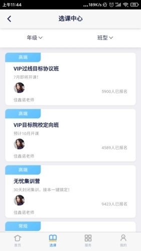 3、设有选课中心,支持按年级或班型筛选课程并添加学习;