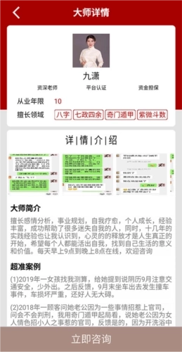 2、在里面挑选一位你满意的命理师,点击其下方的【立即咨询】按钮,就能和真人命理师开展卜卦交流了。