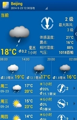 1、当前天气状况,配备实时背景展示的24小时天气预报,以及包含每三小时数据的7天天气预报