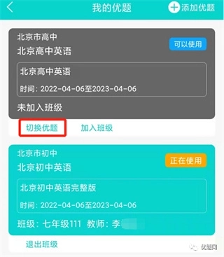 点击底部导航栏的【我】,进入【我的优题】页面后,在高中或初中版板块下方找到【切换优题】按钮并点击,就能完成初中版到高中版的切换。