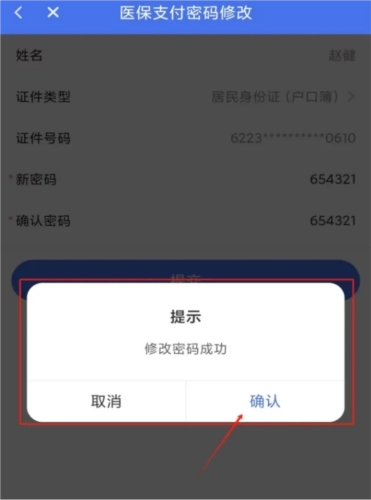4、密码修改。完成人脸识别验证后,系统会自动修改医保支付密码,并弹出“修改密码成功”的提示。密码修改好之后,参保人就能用新密码在定点医药机构刷医保卡进行医保结算了。
