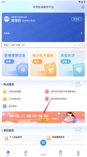 1、甘肃医保服务平台首页选择【新生儿服务专区】。
