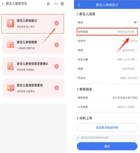 2、选择【新生儿参保登记】选项来填写新生儿相关信息,其中“证件类型”包含居民身份证(户口簿)与出生医学证明这两类,办理新生儿参保登记业务时,用户可以从这两种证件类型里任选其一进行填写。