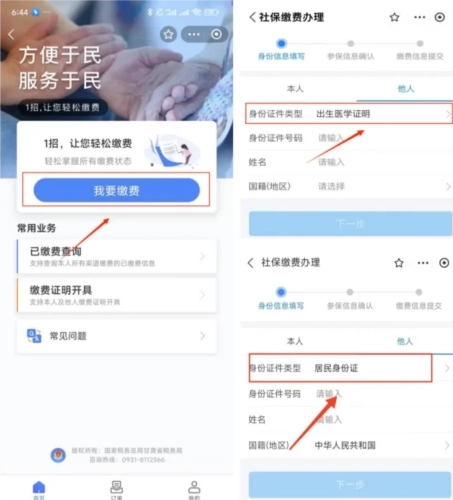 5、进入“新生儿服务专区”,点击【新生儿参保缴费】,页面将跳转至税务缴费界面。接着选择【我要缴费】,通过微信或支付宝完成用户授权后,填写待缴费新生儿的相关信息,其中身份证件类型可选择“出生医学证明”或“居民身份证”,随后进行缴费操作。