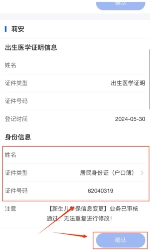 6、进入“新生儿服务专区”,找到并选择【新生儿参保信息变更确认】功能。接着,挑选需要进行变更操作的新生儿信息,准确输入该新生儿的身份证号码,在仔细核对信息确保无误后,点击“确认”按钮,这样就完成了变更申请的提交。待相关部门审核通过后,系统会通过短信的方式将结果告知代办人,也就是新生儿的父母。