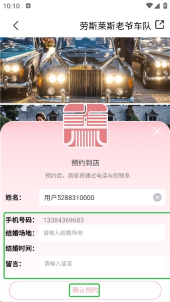 6、输入姓名以及结婚场地,点击确认预约即可。