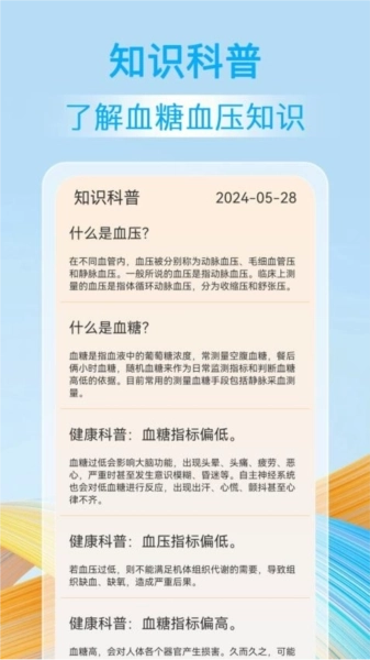 软件内关于血糖血压的知识科普内容十分详尽,能帮助用户迅速掌握相关知识。